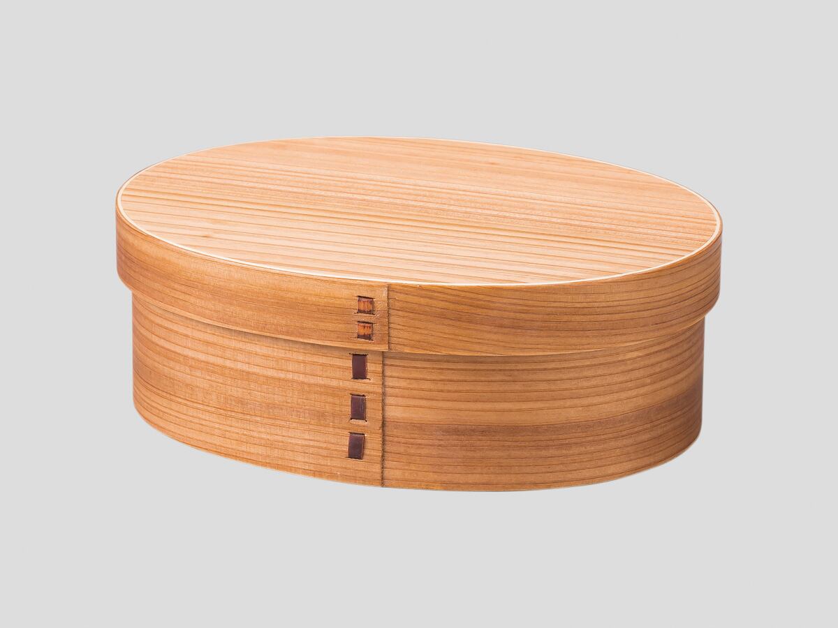杉の木目が美しい。人気の曲げワッパ、ちょっと赤み掛かった色が特徴です。