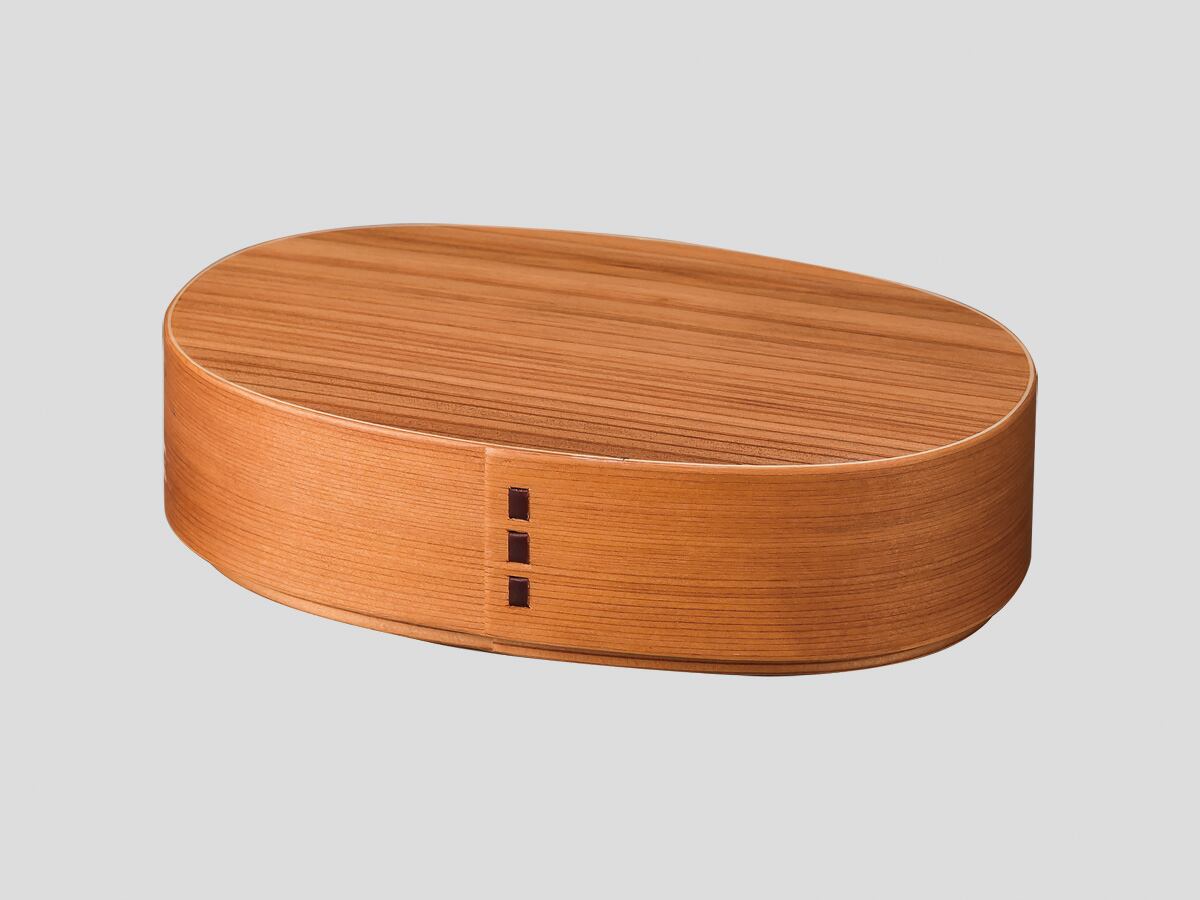 杉の木目が美しい。人気の曲げワッパ、ちょっと赤み掛かった色が特徴です。