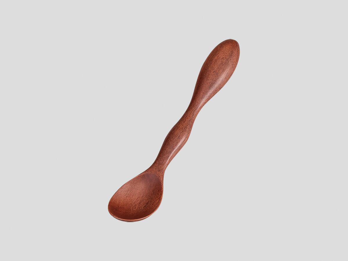 小さな手でも握りやすい持ち手の形状です。口触りも優しく、食べ物も掬いやすい木地の薄さになってます。
