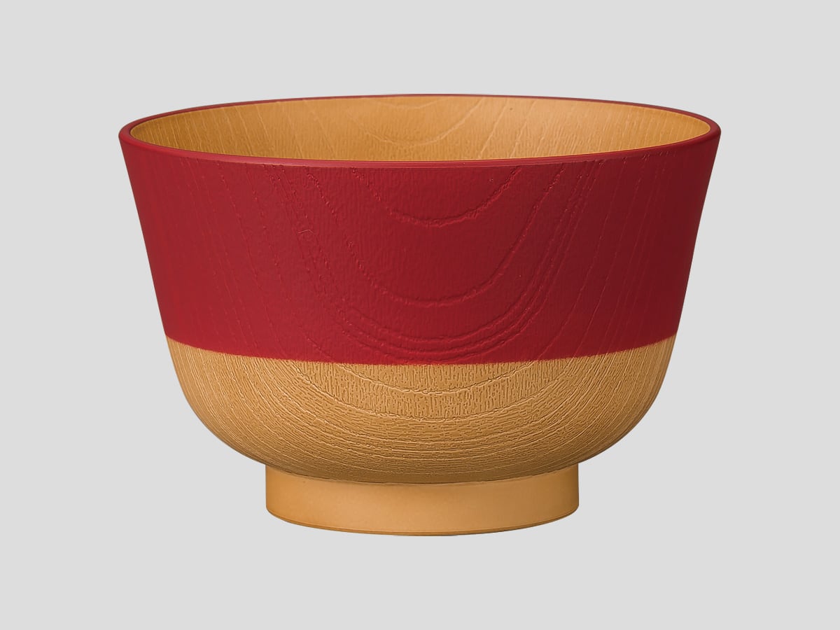 白木調の下地にあかね色を塗分けした軽くて割れにくい樹脂製のお椀です。家庭用食器洗浄機・電子レンジ対応。