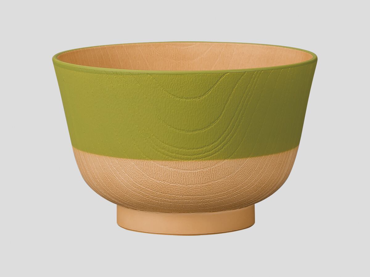 白木調の下地にうぐいす色を塗分けした軽くて割れにくい樹脂製のお椀です。家庭用食器洗浄機・電子レンジ対応。