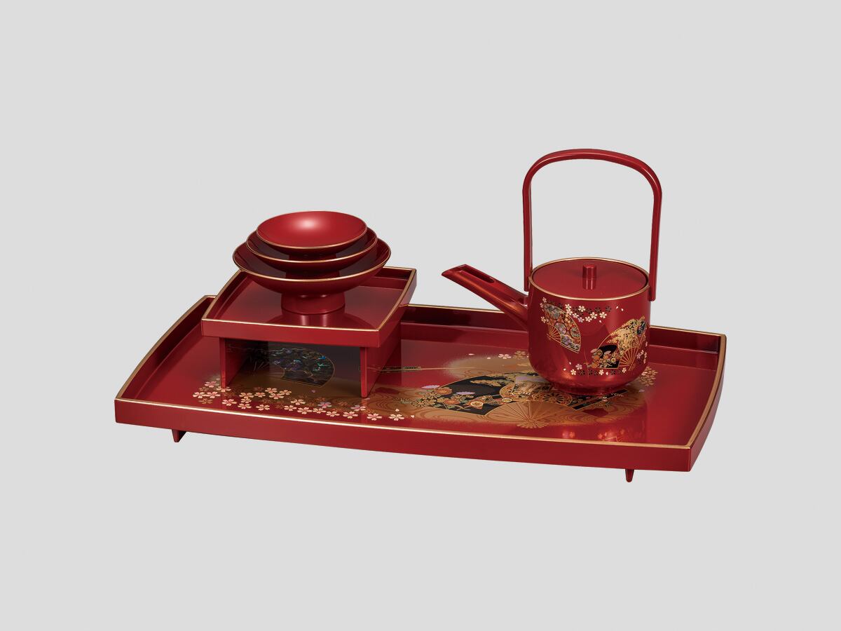 サイズ: 屠蘇台36.7×22.6×3 銚子 15×8.5×16.7 盃台13×13×5.2 盃小 φ7.8 盃中 φ9 盃大 φ10.5